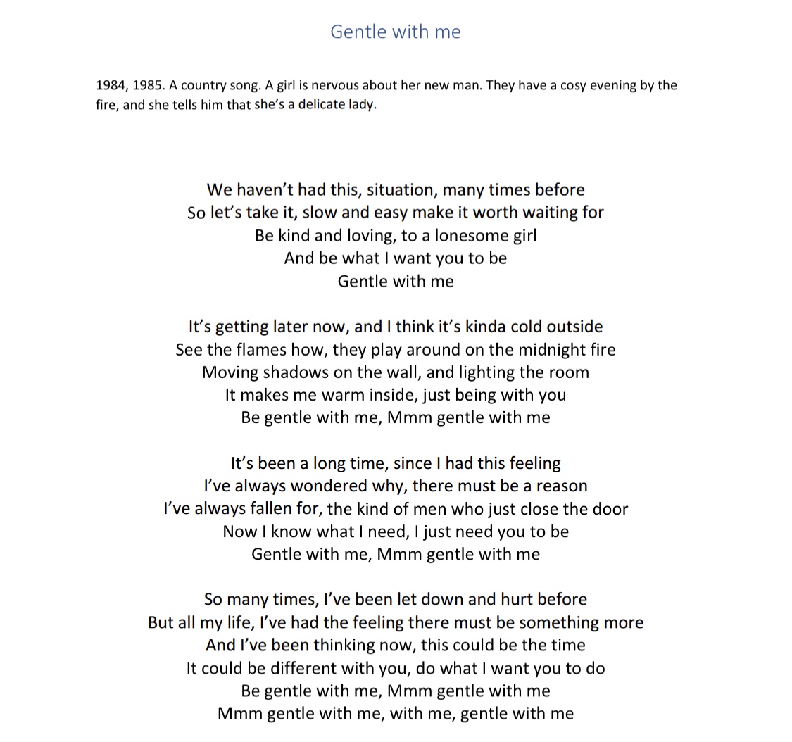 Gentle with me Gentle with me, backing track Share this: Click to share on X (Opens in new window) X Click to share on Facebook (Opens in new window) Facebook Like Loading...