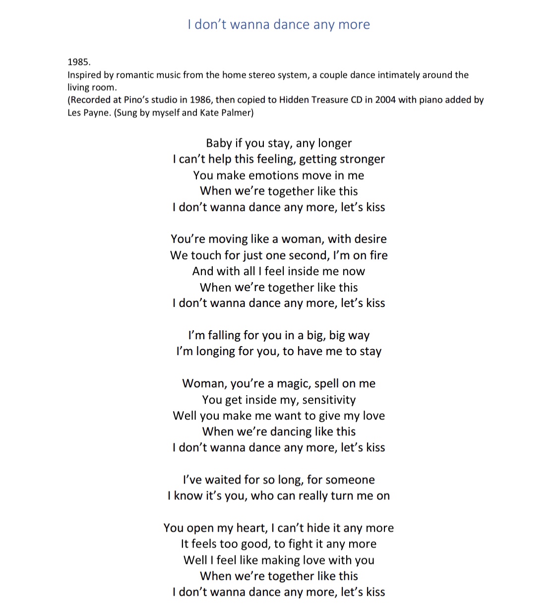 I don’t wanna dance anymore I don’t wanna dance any more, backing track Share this: Click to share on X (Opens in new window) X Click to share on Facebook (Opens in new window) Facebook Like Loading...