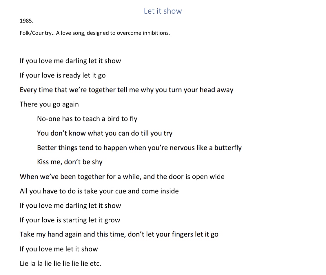 Let it show Let it show, backing track Share this: Click to share on X (Opens in new window) X Click to share on Facebook (Opens in new window) Facebook Like Loading...