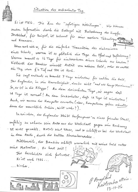 In November 1986, I got a second-hand van and took it over to Germany to visit some of the people I’d got to know. Pip and Linden came along for the ride. The van broke down, and the other two went on to Holland, while I waited for a new engine to be sent over from England. I went to a concert and saw a student band. Then I heard on the radio that a toxic cloud had come over from Switzerland and would pass quite near to where I was (sleeping in the cold van).