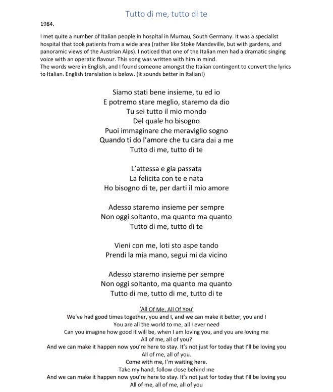Tutto di me, Tutto di te This play button is not ‘I’ve only got one heart’ – it’s actually the backing track for the Italian Song: Share this: Click to share on X (Opens in new window) X Click to share on Facebook (Opens in new window) Facebook Like Loading...